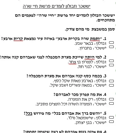 דף עבודה הבנת הנקרא – חיי שרה – יששכר וזבולון לומדים פרשת חיי שרה