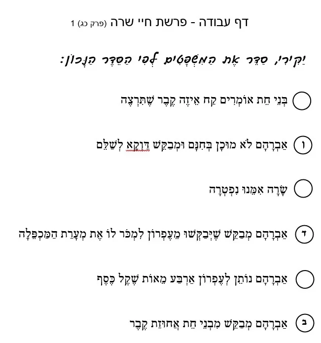 דף עבודה הבנת הנקרא – פרשת חיי שרה פרק כג 1 – סַדֵּר אֶת הַמִּשְׁפָּטִים לְפִי הַסֵּדֶר הַנָּכוֹן