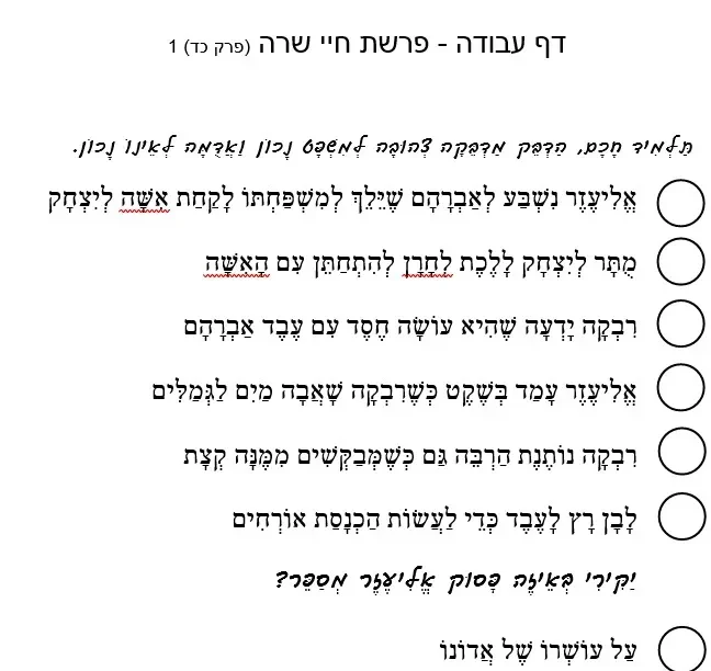 דף עבודה הבנת הנקרא – פרשת חיי שרה פרק כד 1 – הַדְבֵּק מַדְבֵּקָה צְהוּבָה לְמִשְׁפָּט נָכוֹן וַאֲדֻמָּה לְאֵינוֹ נָכוֹן
