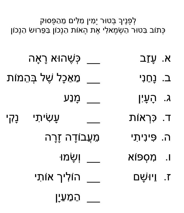 דף עבודה הבנת הקרא – חיי שרה כז – מא – כְּתוֹב בַּטוּר הַשְׂמָאלִי אֶת הָאוֹת הַנָכוֹן בַּפֵּרוּשׂ הַנָכוֹן
