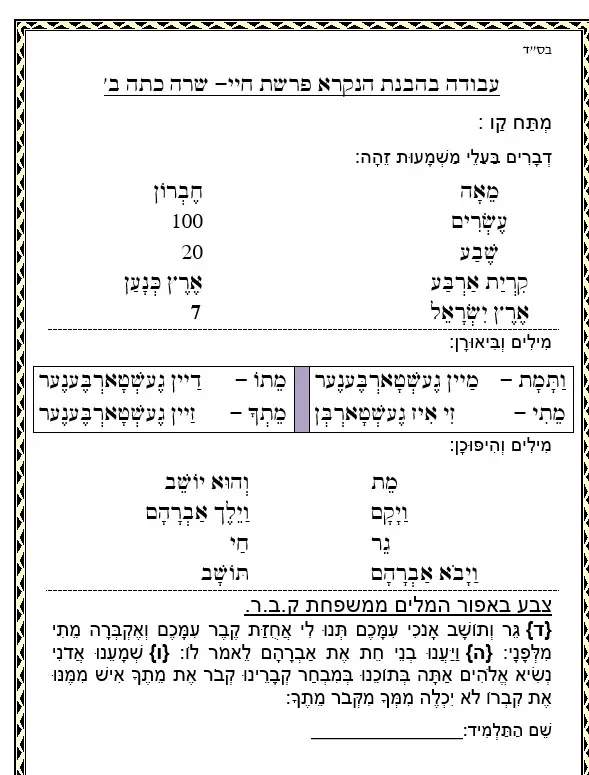 דף עבודה – חיי שרה – זהה – היפכן – ביאור – שורש