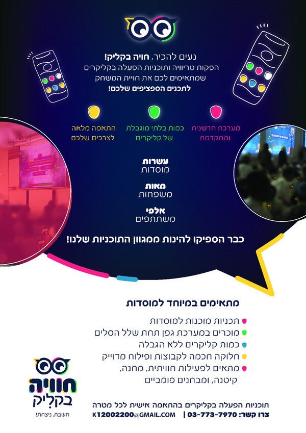 חברתינו מתמחה בהפקות טריוויה ותוכניות הפעלה בקליקרים ובטלפונים שמתאימים לכם את חויית המשחק לתכנים הספציפים שלכם!